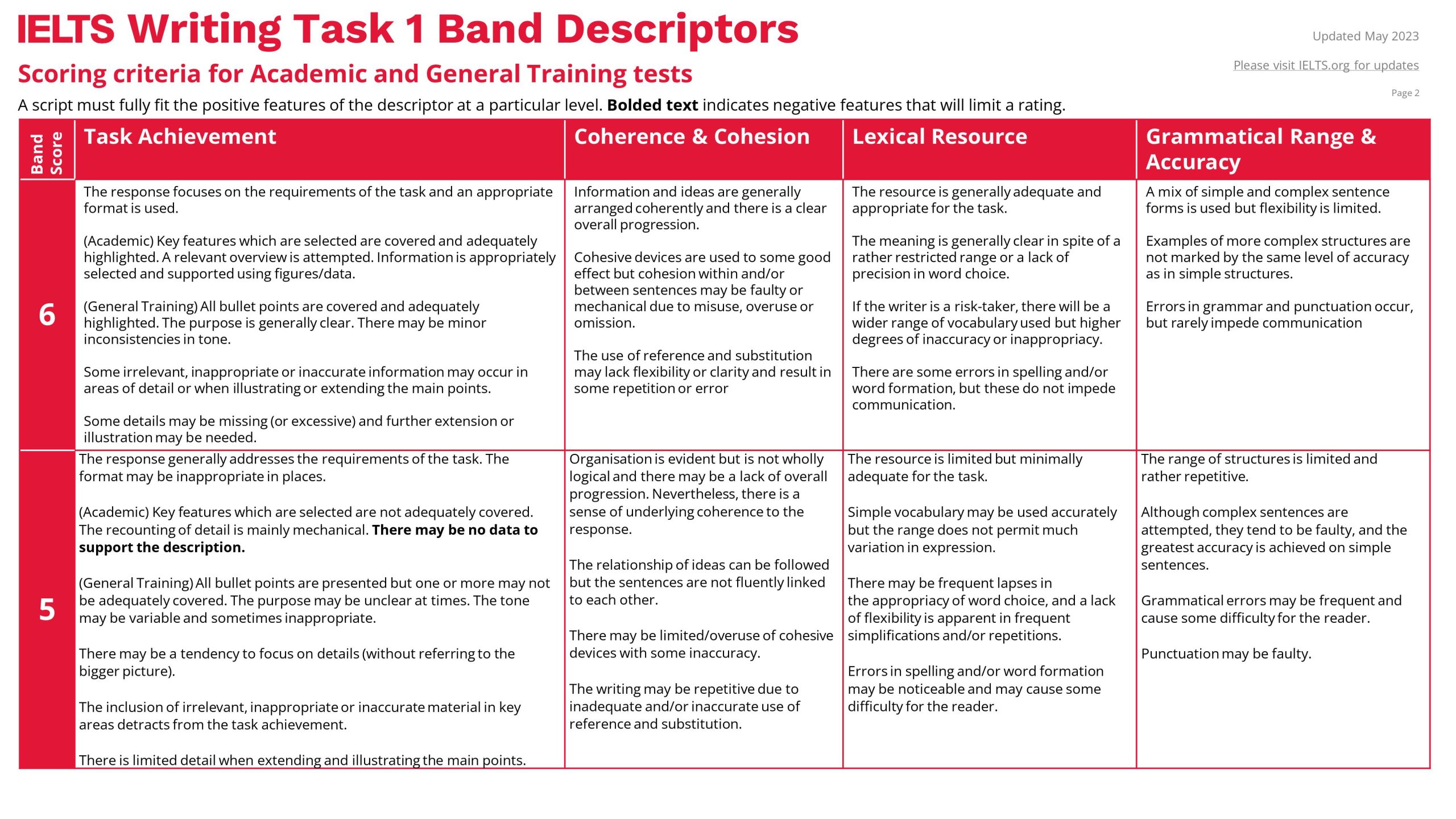 Example: If you get 5.5/9 in Task 1 and 6/9 in Task 2, you get 6 bands overall in writing.